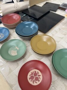 The table was filled with small plates coated in vivid layers of red, blue, yellow, and green lacquer.